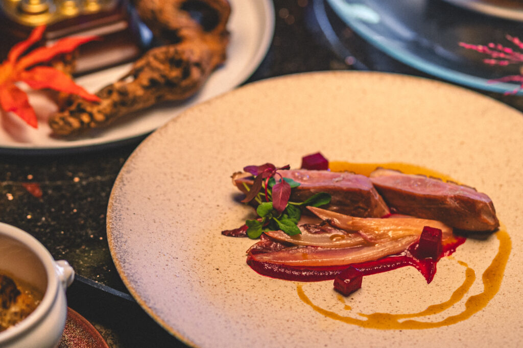 ・お肉 ~鴨のロースト ビーツのクーリーと柚子香るソース~